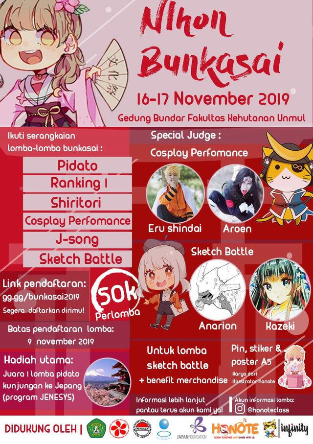 Collaborating with Japanese teachers around Borneo and Surabaya's Consulate-General of Japan, we participated as digital assets provider for a school event (bunkasai) where students around Borneo are participating in competitions. We also do mascot design, merchandising and Judges for drawing competition.